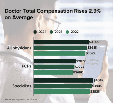 The average physician earned $374,000 in 2024, up from $363,000 the year before — a modest 2.9% increase.
