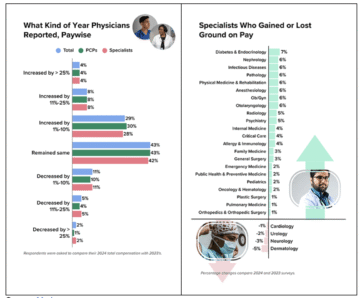 In 2024, nearly 70% of physicians reported either flat earnings or only single-digit income increases — a sign that post-pandemic salary gains have largely tapered off. About half of all medical specialties reported a compensation gain of 2% or less, and several specialties saw declines.