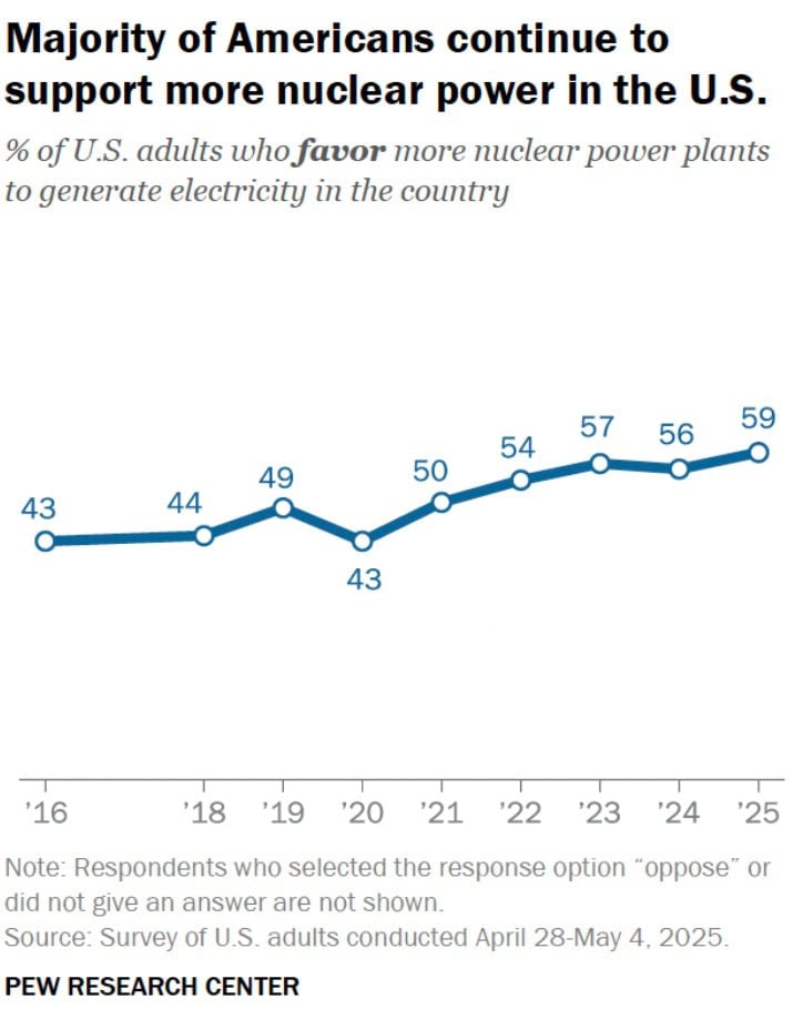 About six-in-ten U.S. adults now say they favor more nuclear power plants to generate electricity, according to a Pew Research Center survey fielded in April and May. That’s up from 43% in 2020, driven by increasing support among both Republicans and Democrats.