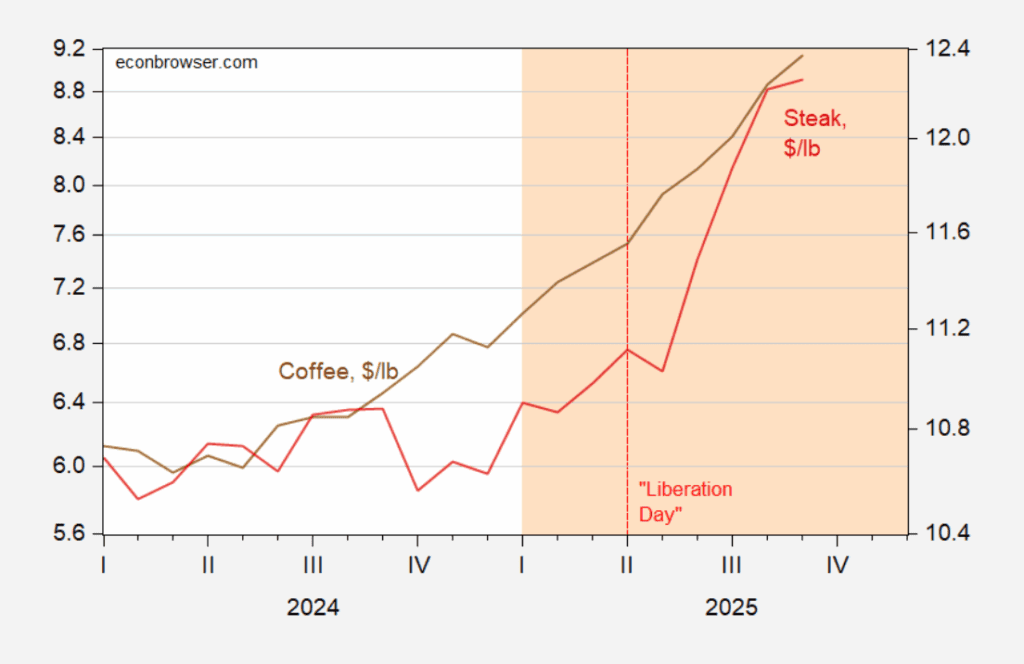 Average price ground coffee, $/lb. (brown, left log scale), and beef steak, $/lb. (red, right log scale). Source: BLS.